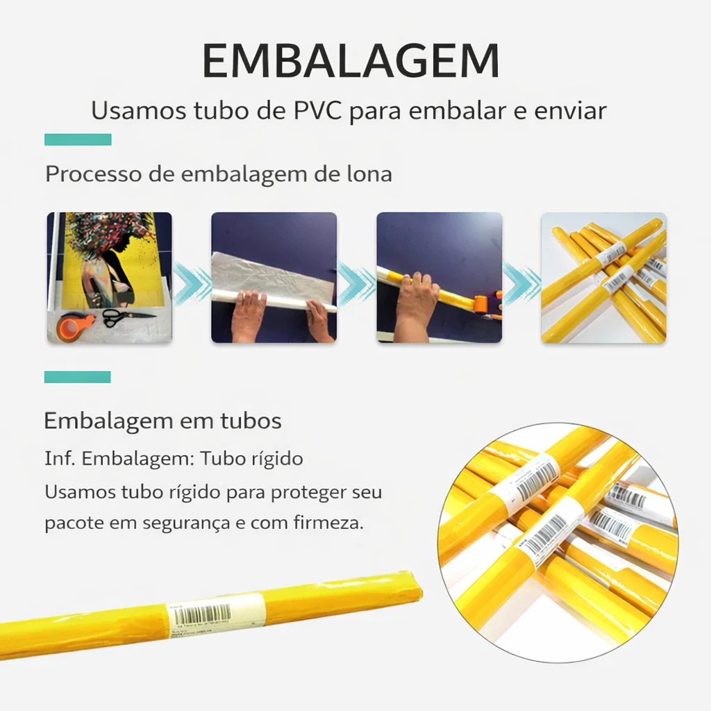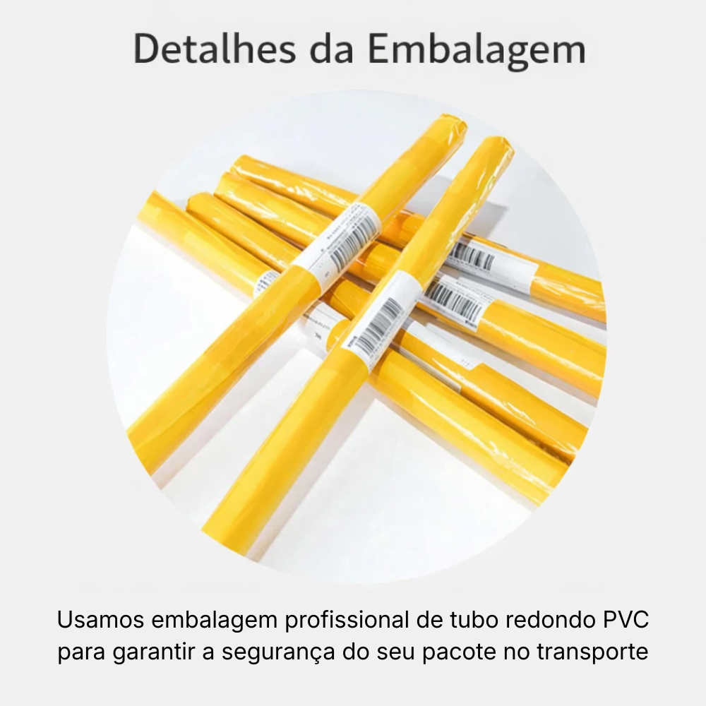 Utilizamos tubos de PVC profissionais e resistentes para garantir a segurança do seu pedido durante o transporte.
